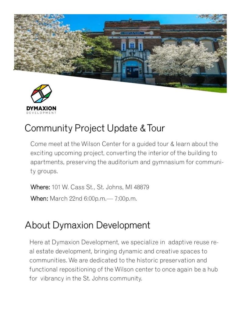 Dymaxion Development will be conducting this short tour this coming Tuesday at 6pm to explain their plans to develop the classroom space of the Wilson Center into apartment units. All are welcome: